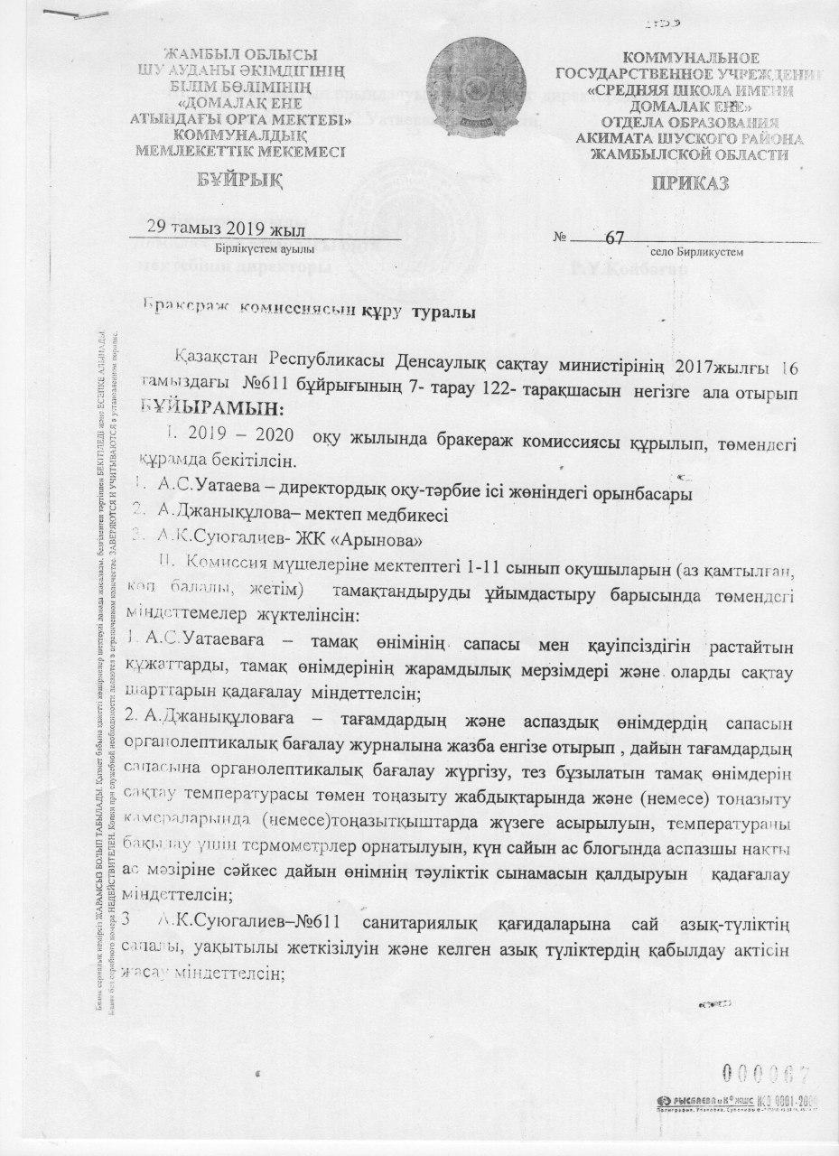 24 февраль 2020 0 1 2 3 4 5 Мектепте тегін тамақтандыру сапасына бақылау жүргізу үшін бракеражды комиссия құру туралы бұйрық