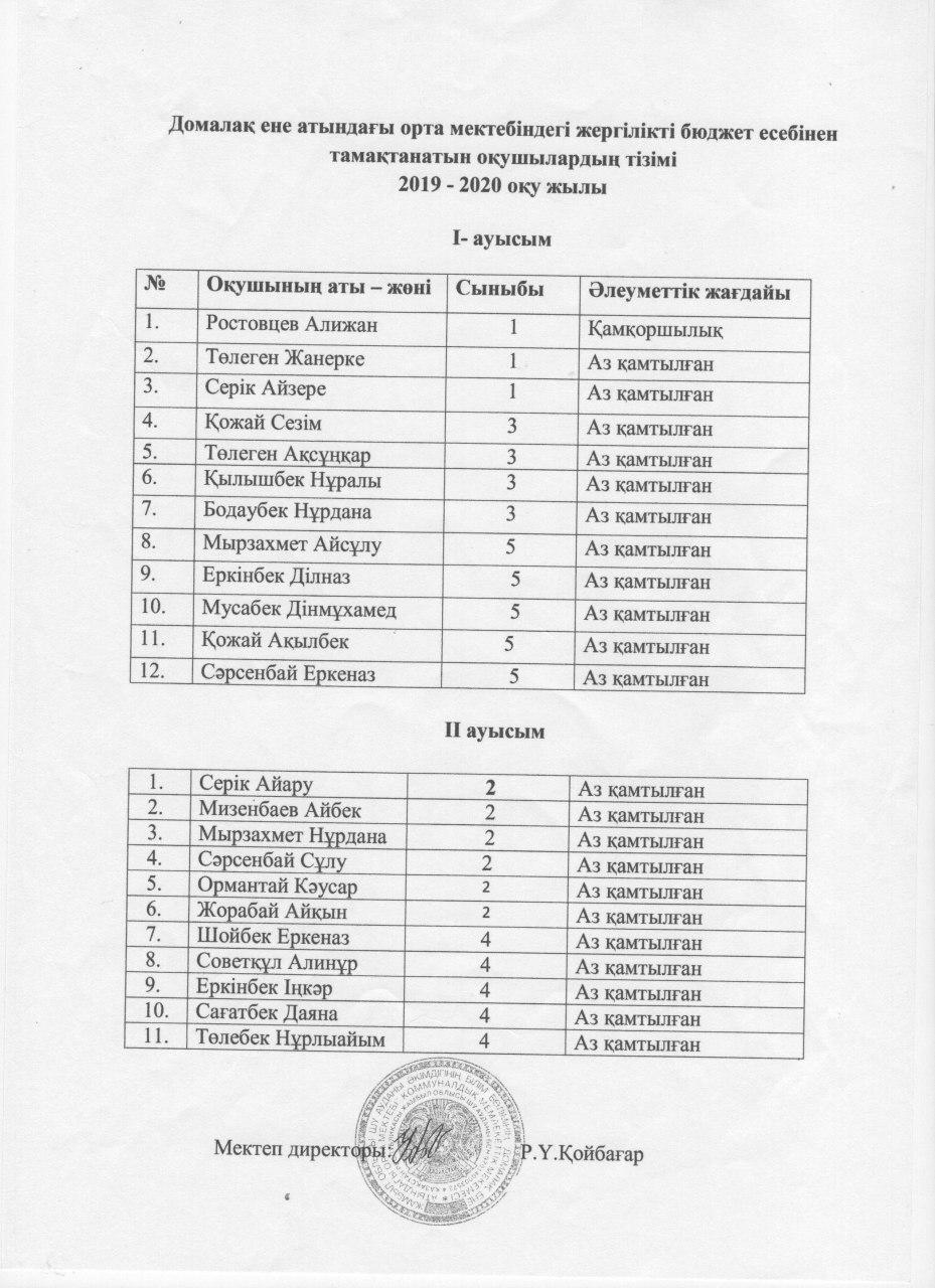 24 февраль 2020 0 1 2 3 4 5 Домалақ ене атындағы орта мектебіндегі жергілікті бюджет есебінен тамақтанатын оқушылар тізімі