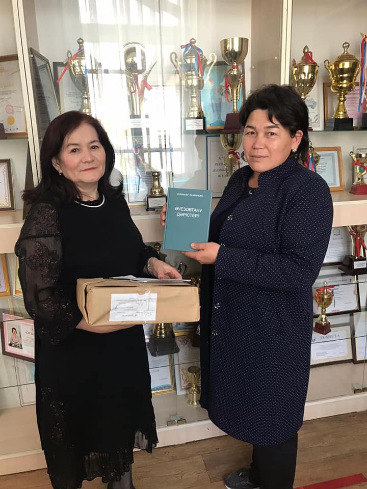 Мектебіміздің түлегі Қиялбекова Гулнәр Құлақметқызы "Әуезов дәрістері" Н. Рахманованың оқу құралын мектеп кітапханасына тарту етті.