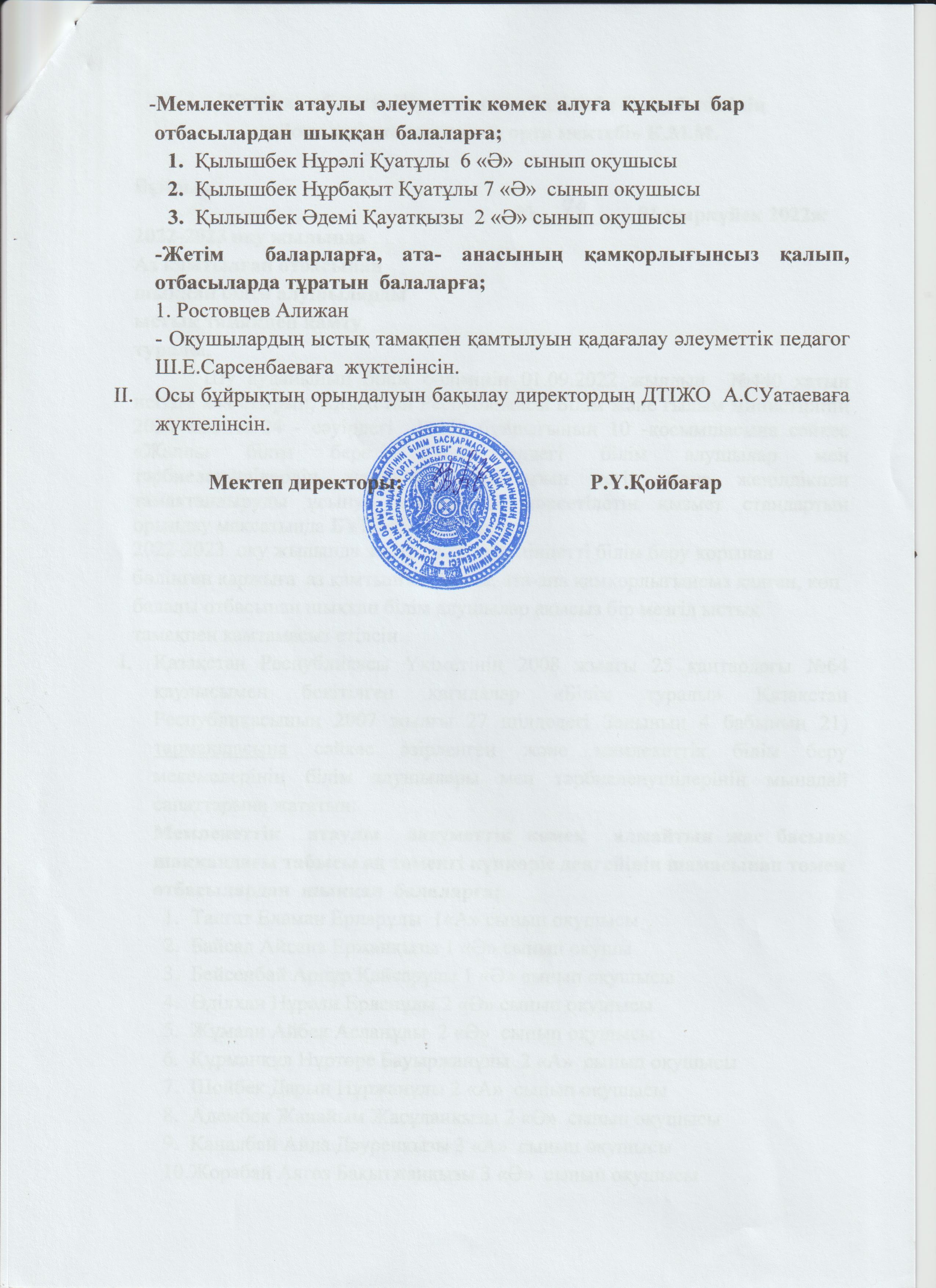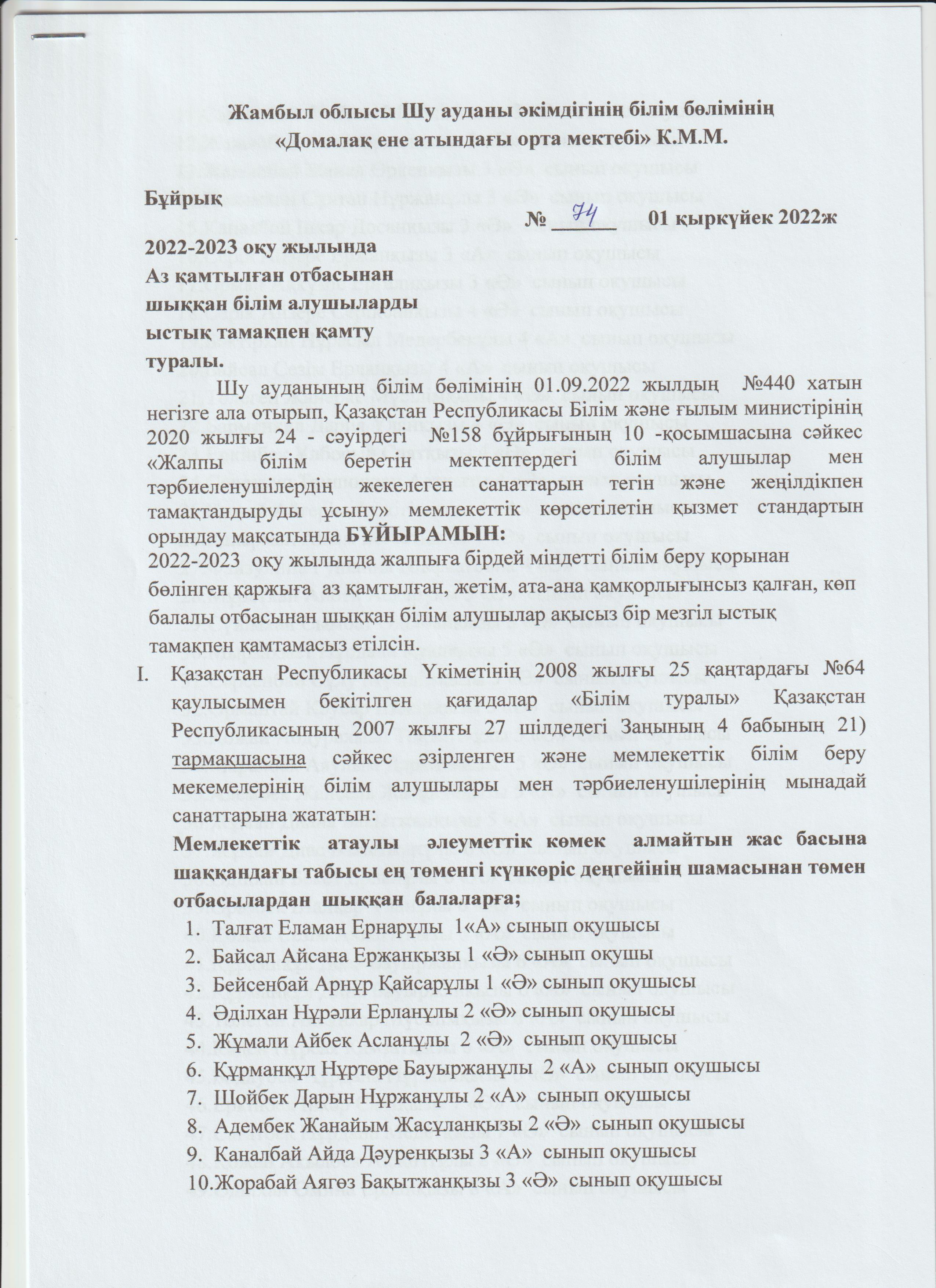 06 октябрь 2022 0 1 2 3 4 5 2022-2023 оқу жылында Аз қамтылған отбасынан шыққан білім алушыларды ыстық тамақпен қамту туралы