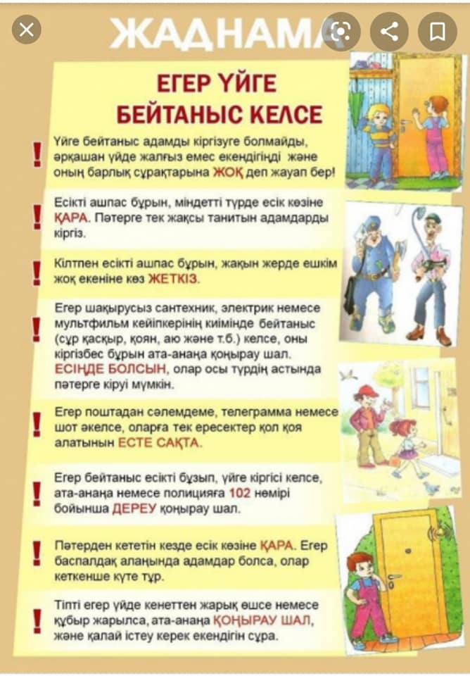 7. Оның дайындығын тексеріңіз Қандай да бір келеңсіз жағдайда жедел қызмет операторына ол өзінің аты-жөнін, тұрғылықты мекен-жайын (қай жерде тұрса, сол жердің мекен жайын), жанындағы үлкендерді, болған жағдайды түсіндіре алуы тиіс.