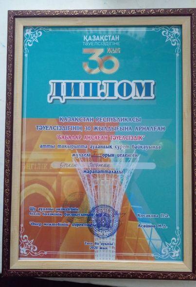 Қазақстан Республикасы Тәуелсіздігінің 30 жылдығына арналған "Бабалар аңсаған Тәуелсіздік" атты тақырыпта аудандық сурет байқауында Домалақ ене атындағы орта мектебінің оқушы  Өркен Тоқжан 1 орынды иеленді.